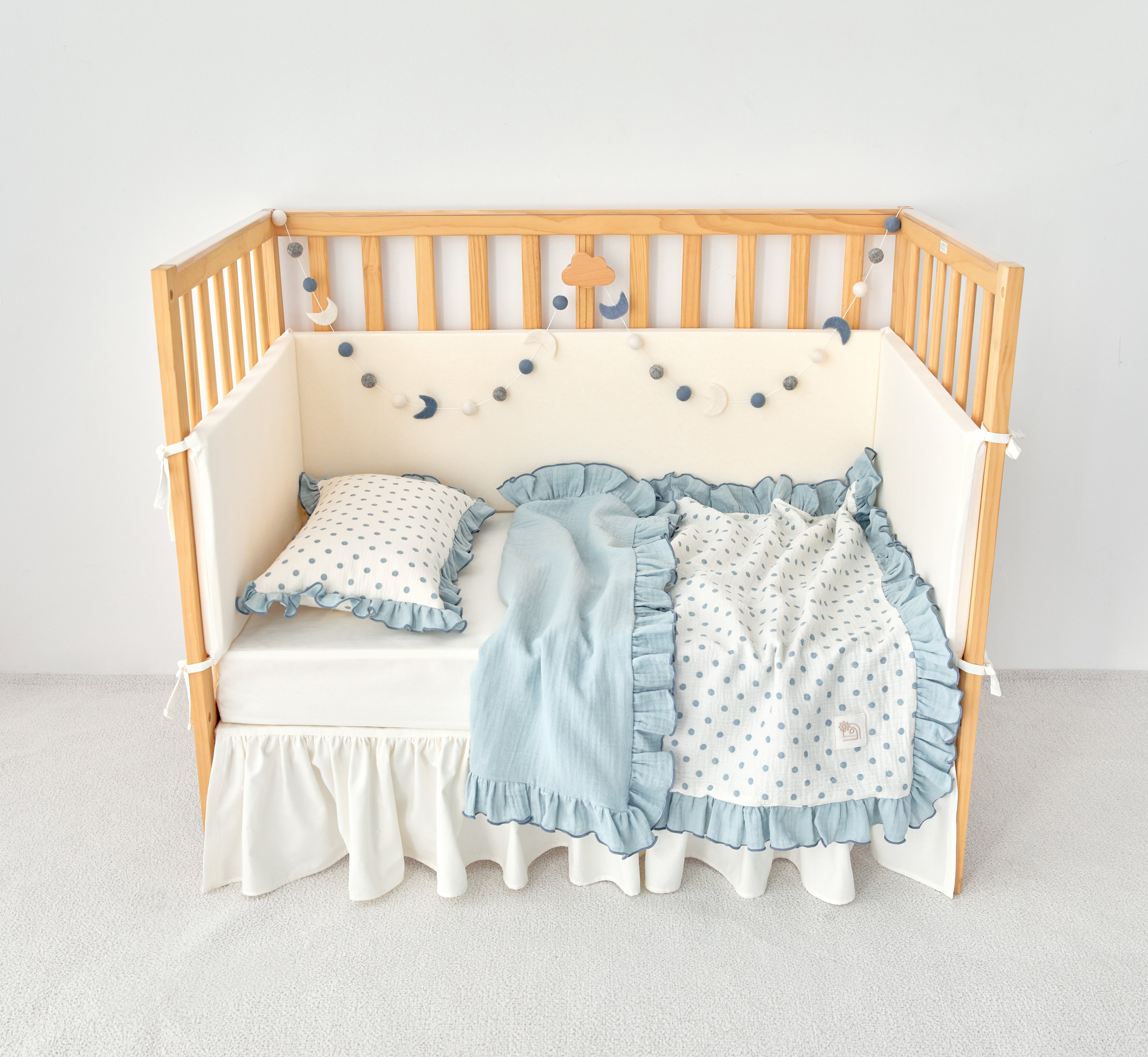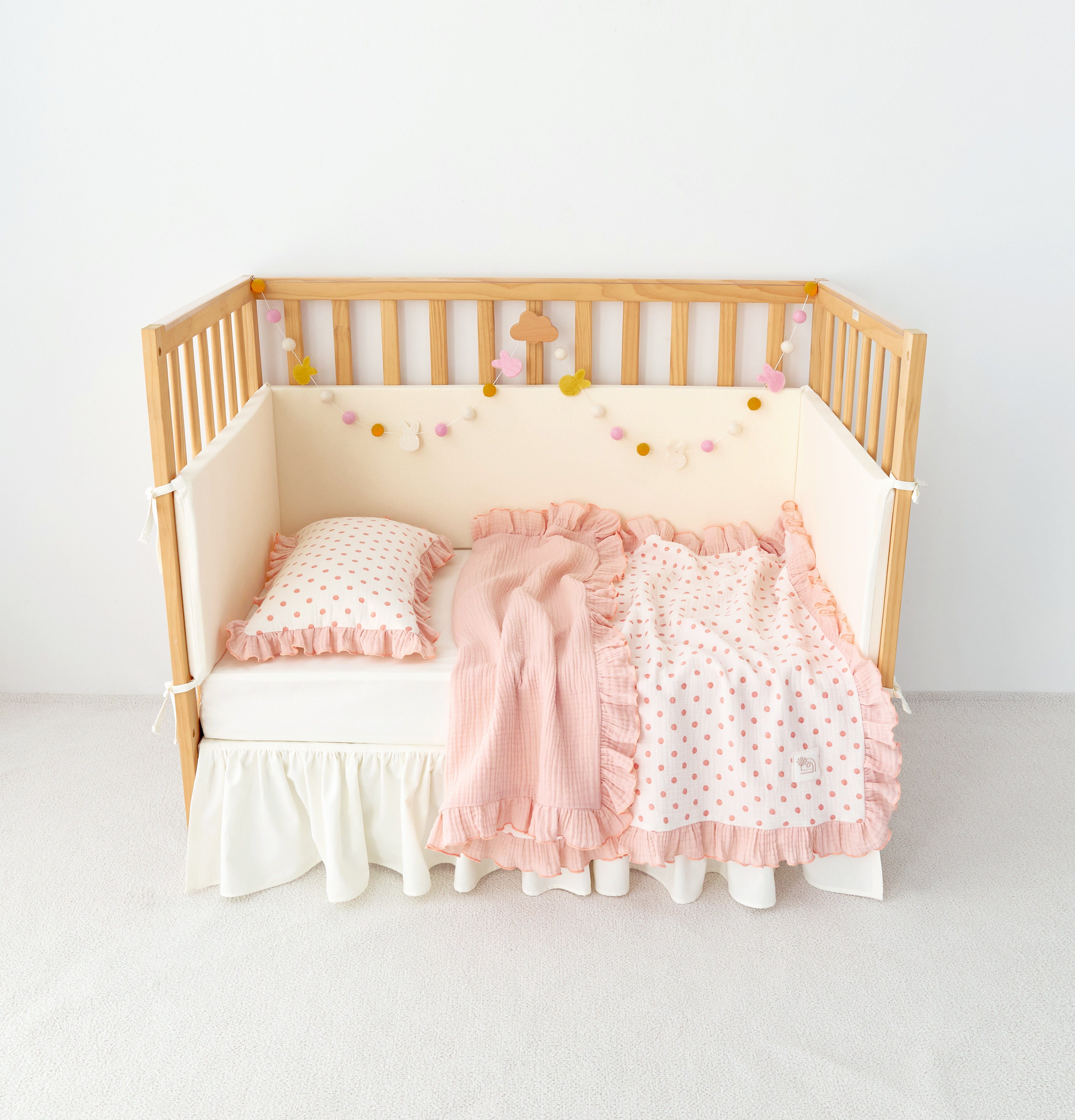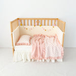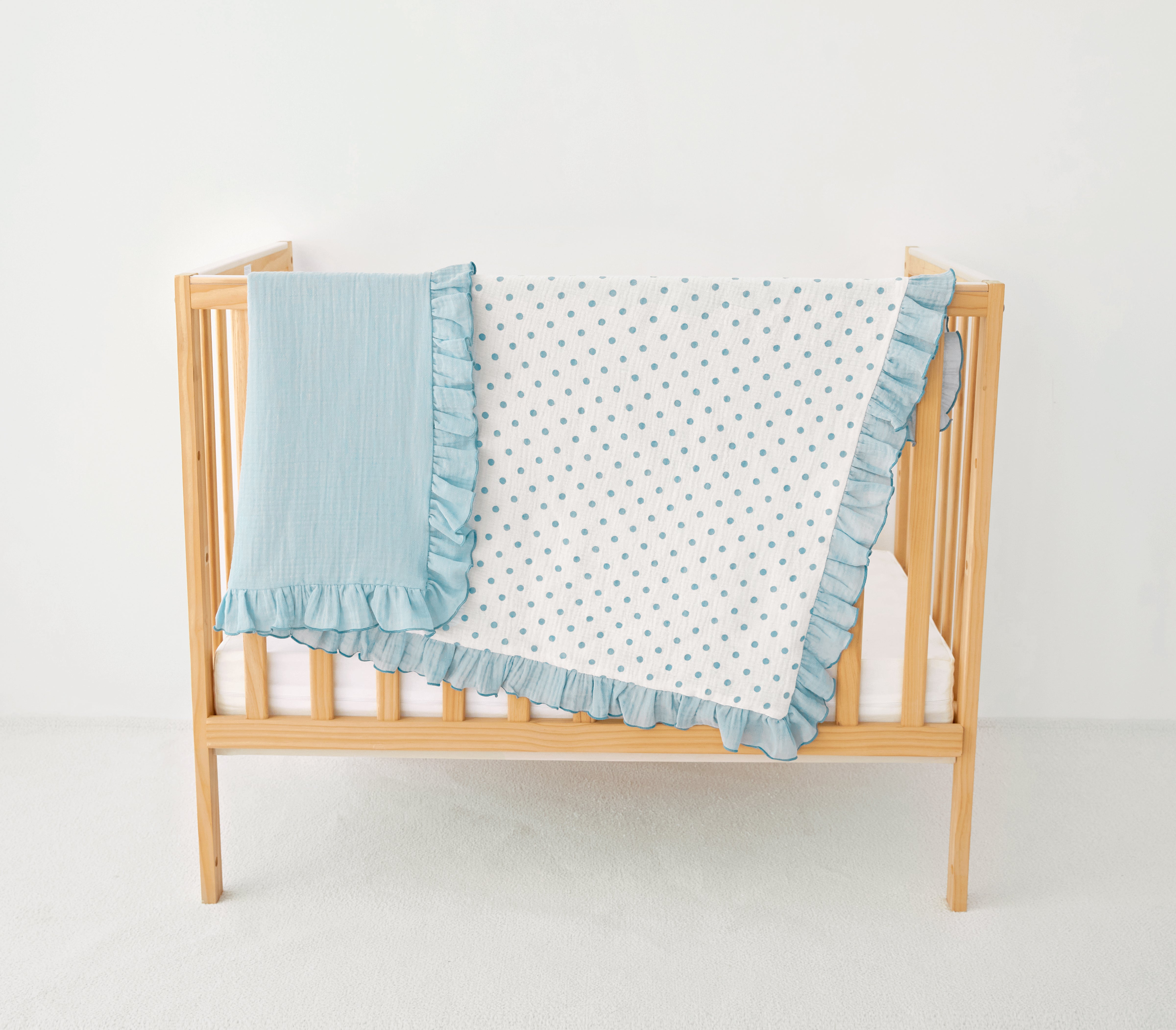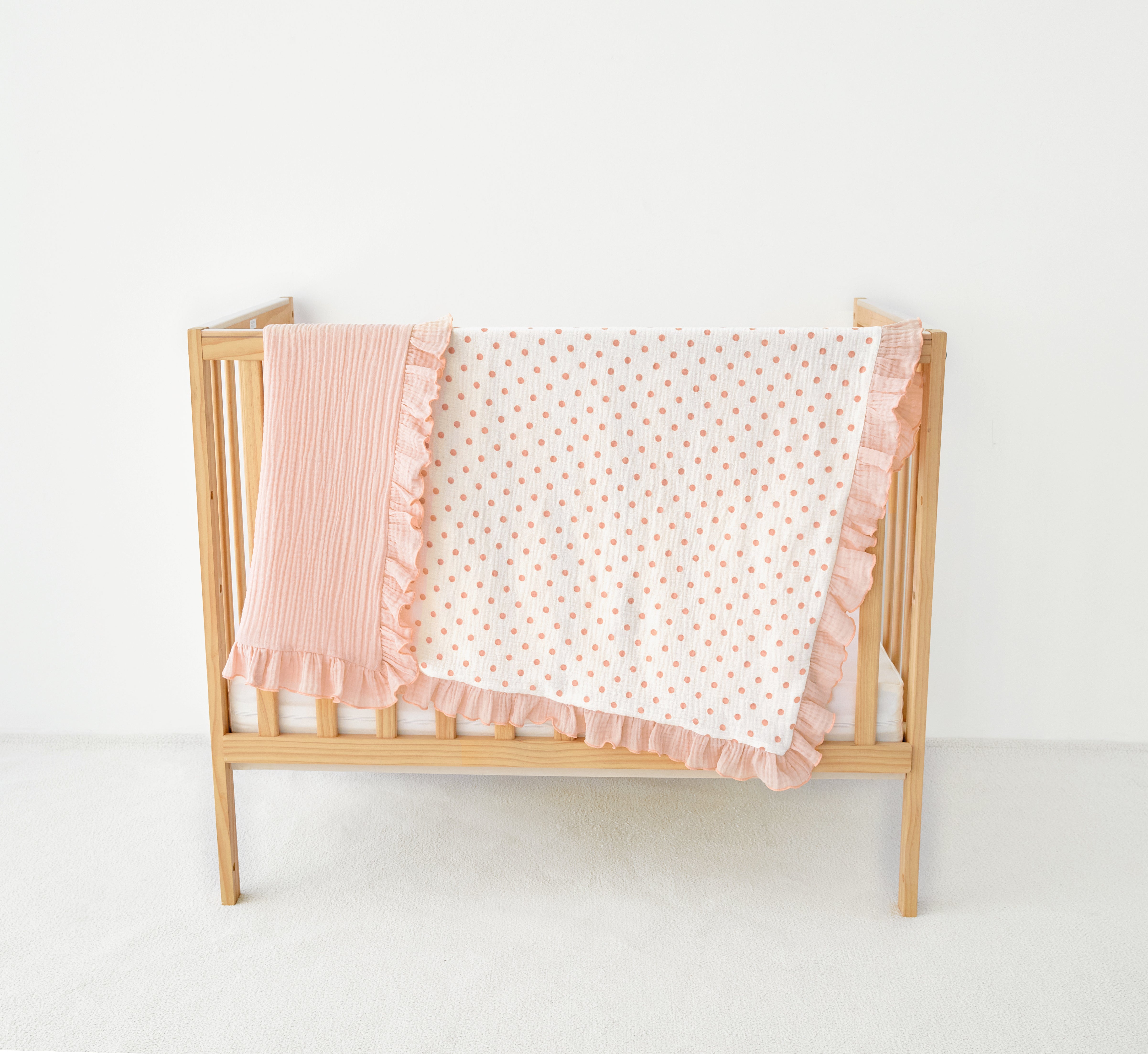 Crafted from breathable, multi-layer cotton gauze (muslin), it provides a lightweight, airy layer that helps regulate temperature for year-round comfort. One side features a classic dotted ivory gauze, while the reverse offers a coordinating solid hue. Finished with a matching ruffle and crisp piped edge, this blanket is a beautifully made essential for every little one.