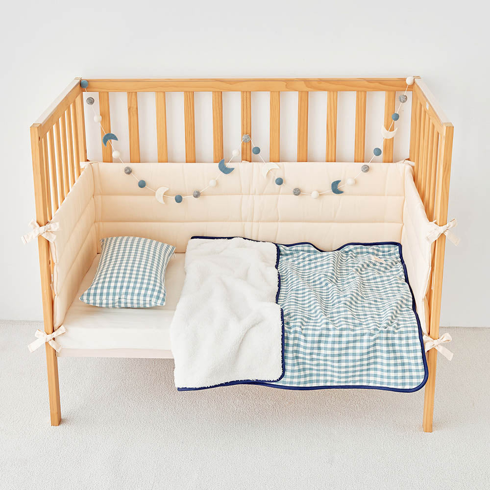 This double-sided blanket is designed for ultimate comfort and versatility. One side features a charming, soft blue gingham print made from breathable 100% Cotton—perfect for slightly warmer weather. The reverse side is lined with a plush, creamy white Microfiber Sherpa fleece, offering an incredibly soft and cozy texture for chilly days. A smart navy piping borders the edge, neatly securing the two fabrics and adding a beautiful, durable finishing detail.