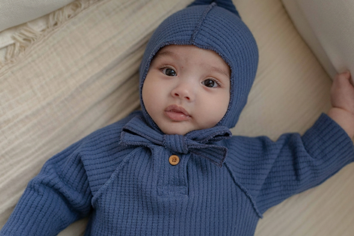 Baby wearing a blue romper onesie with a bonnet on a light-colored surface