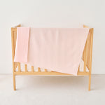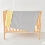 Wooden crib with a blue and white striped toddler knit gauze blanket on a light background